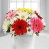 Beyaz gerbera, beyaz lilyum, beyaz gül, cipso ve yeşilliklerle süsleyerek seramik vazoda aranje ettik.