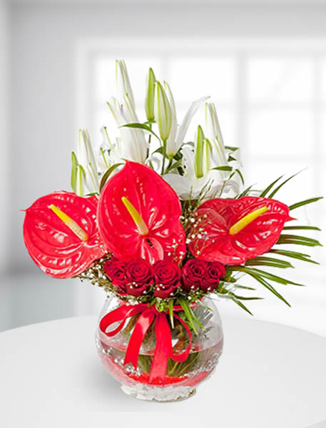 Akvaryum cam içerisinde Kırmızı Gül, Beyaz Lilyum ve Kırmızı Antoryum çiçekleri kullanılarak hazırlanan çiçek aranjmanı ile sevdiklerinizi mutlu edin.