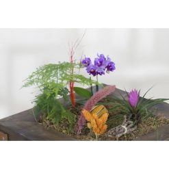 İçerik: { Çift dal mini mor orkide }, { ahşap el yapımı tepsi saksı } , { tillandsia cyanea } , { kuşkonmaz } , { kuru ağaç dalları } , { kuru çiçekler } , { kuru meyve } , { kaya yosunu }